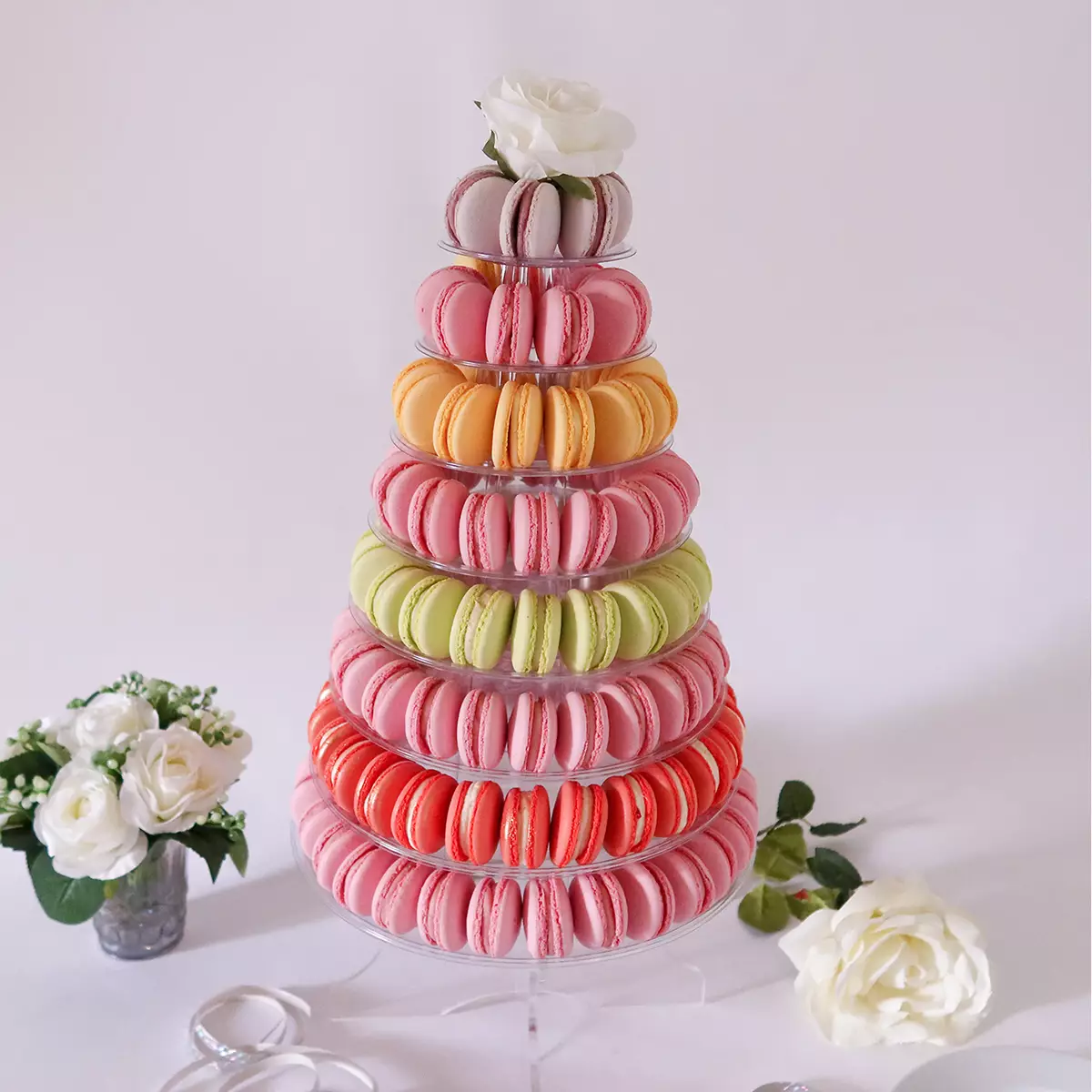 Macaronleivokset ja teline toimitetaan erillisiin rasioihin pakattuna, sillä macarontornin asettelu/ kokoaminen etukäteen ei ole kuljetuksen kannalta mahdollista. Varmista, että teline on koottu ja kiinnitetty lopulliselle paikalleen ennen macaronien järjestämistä telineeseen.