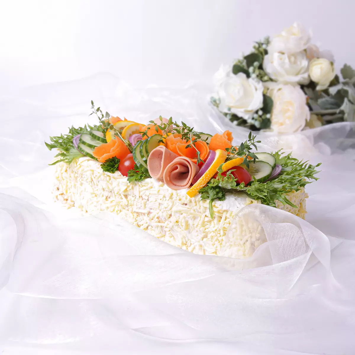 Voileipäkakku on juhlapöydän perinteisin ja suosituin tarjottava, jota kannattaa varata maisteltavaksi täytekakkujen oheen. Oman leipomon vaaleaan gluteenittomaan leipään leivottu vegaaninen voileipäkakku valmistetaan herkullisella täytteellä, joka sisältää tomaatin ja yrttien makuista kasvisleikkelettä, kasviksia ja vegaanista majoneesia sekä tuorejuuston kaltaista valmistetta. Kakku koristellaan näyttäväksi tuoreilla kasviksilla sekä vegaanisella juuston kaltaisella raasteella. Sopii jokaiselle, maistuu kaikille!