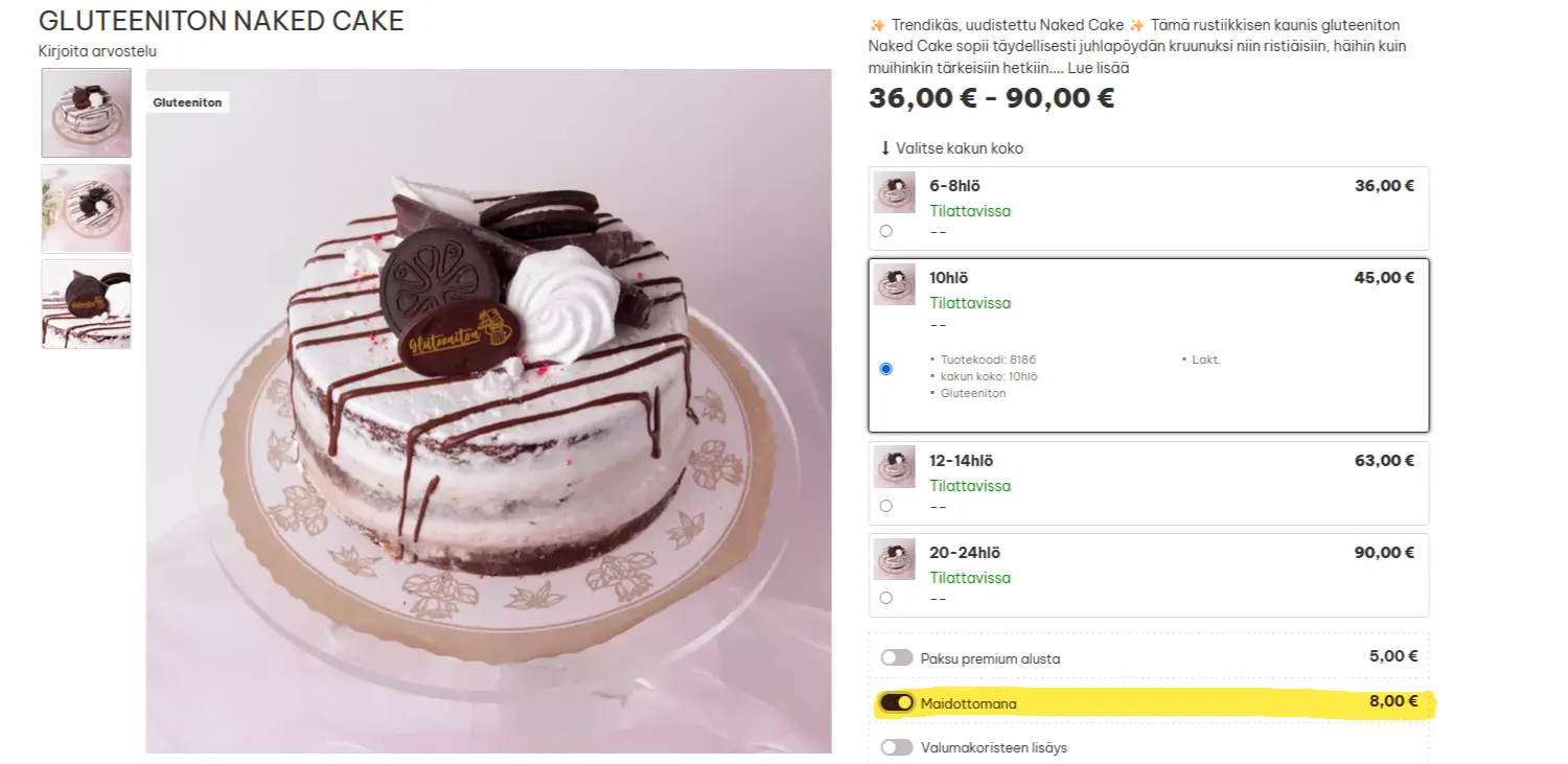 ** - merkillä varustetut kakut ja tuotteet sisältävät oletuksena maitotuotteita, mutta ne on mahdollista tilata myös täysin maidottomista aineksista leivottuina. Klikkaa tällöin ruksi ☑ maidottomana - ruutuun kakusta löytyvän muutosvalikon alla ("muutokset"), niin kakku leivotaan raaka-aineiden osalta täysin maidottomana. Huomioithan kuitenkin, että käsittelemme tiloissamme maitotuotteita, joten kaikki tuotteet saattavat sisältää jäämiä huolellisesta valmistuksesta huolimatta.