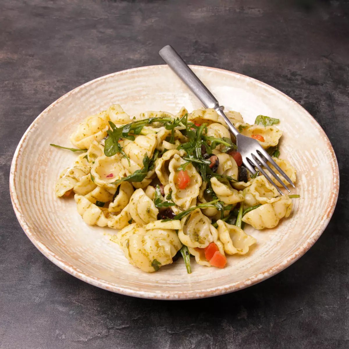 Tämä pestolla maustettu salaatti on helppo ja varma valinta monenlaisiin tilaisuuksiin, sillä se sopii moneen erityisruokavalioon. Se toimii sekä pääruokana että muun tarjoilun rinnalla ruokaisana lisukkeena. Valmistettu Heinosen omassa keittiössä Joensuussa.