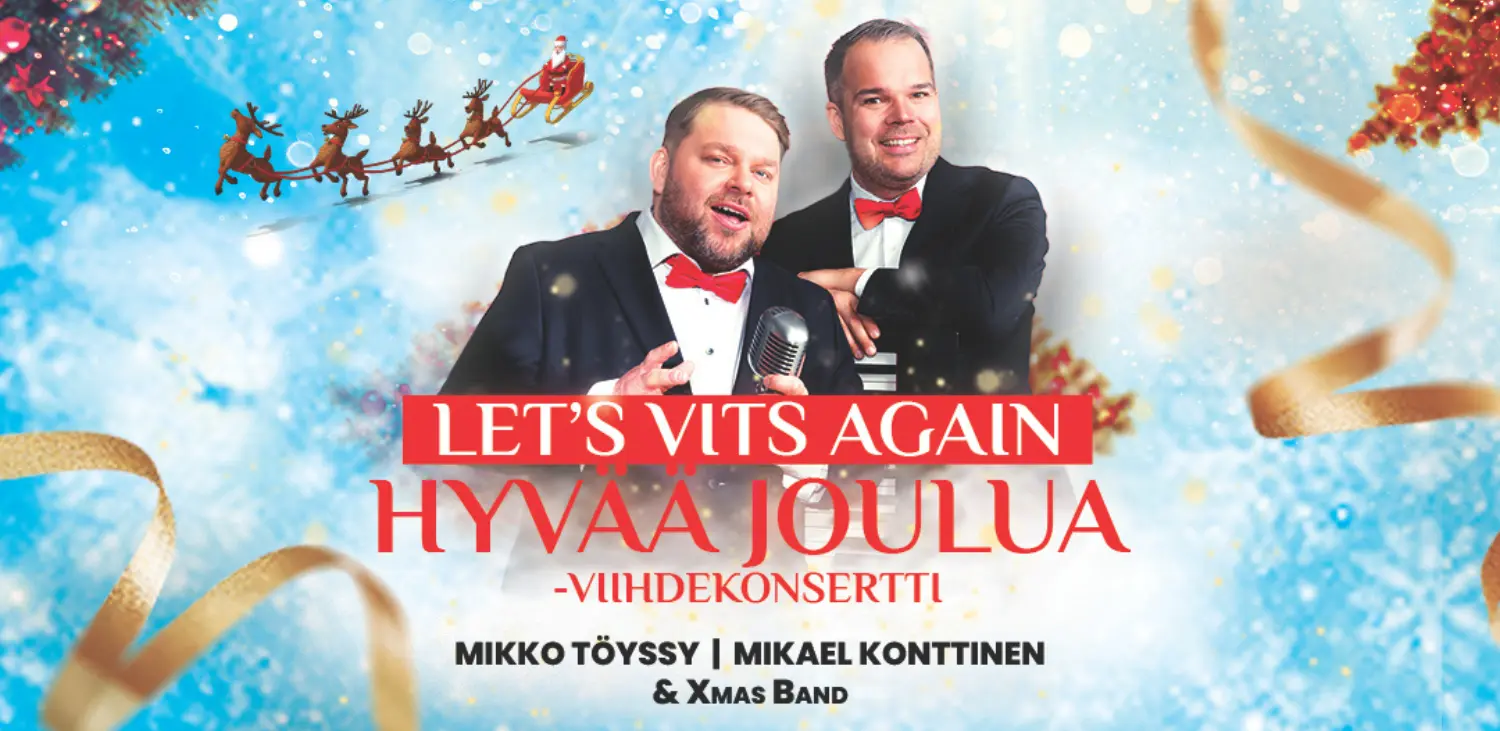 Let’s Vits Again – Hyvää joulua! on lämminhenkinen joulukonsertti, jossa Mikko “Tökä” Töyssy ja Mikael “Micke” Konttinen yhdistävät musiikin ja komedian. Lavalla kuullaan rakastettuja jouluklassikoita ja kevyttä huumoria. Luvassa on rentoa ja iloista joulufiilistä. Lue lisää ja tutustu tapahtumaan »