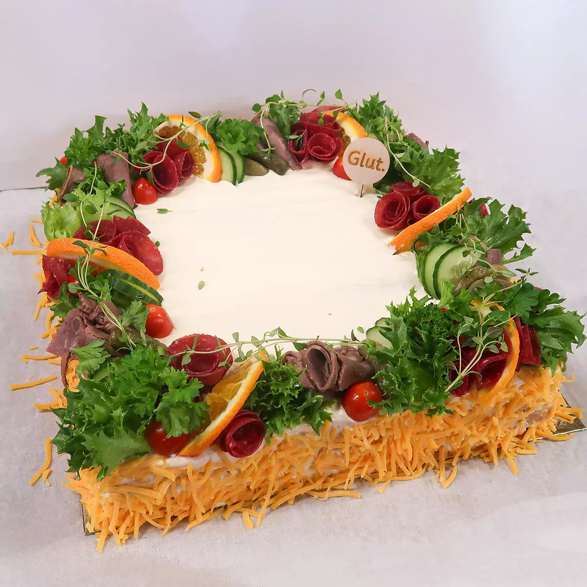 Kun kekkerit ovat suuret ja vieraiden joukosta löytyy takuulla erityisruokavalioita noudattavia, gluteeniton paahtopaistivoileipäkakku on täydellinen valinta kahvipöytään. Tämä lihavoileipäkakku riittää jopa 30 hengelle ja maistuu kaikille. Mehukas paahtopaisti yhdistyy kakussa tuoreisiin ja laadukkaisiin raaka-aineisiin, kuten täyteläiseen cheddarjuustoon ja raikkaisiin kasviksiin. Gluteenittomista aineksista leivottu pohja on yhtä pehmeä ja maukas kuin tavallinen leipäkin ja kakun näyttävä koristelu varmistaa, että se kerää takuulla kehuja juhlissa.