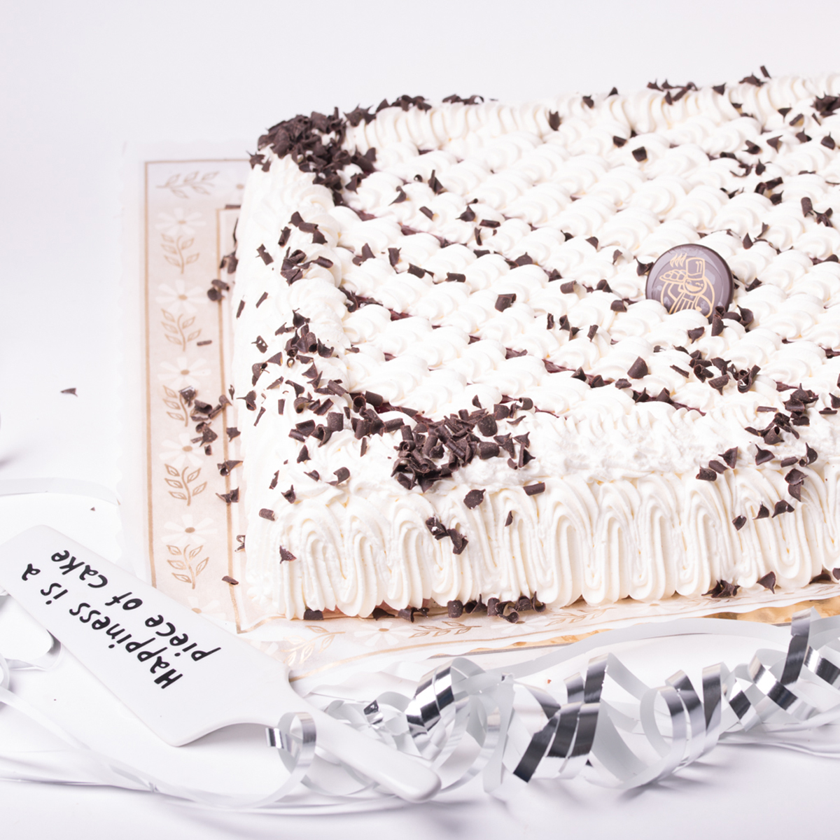 Levykakkumme pakataan tukevaan rasiaan, jonka koko on noin 38 x 57 x 10 cm. Varmistathan, että jääkaapissasi on tarpeeksi tilaa tätä kakkua varten.