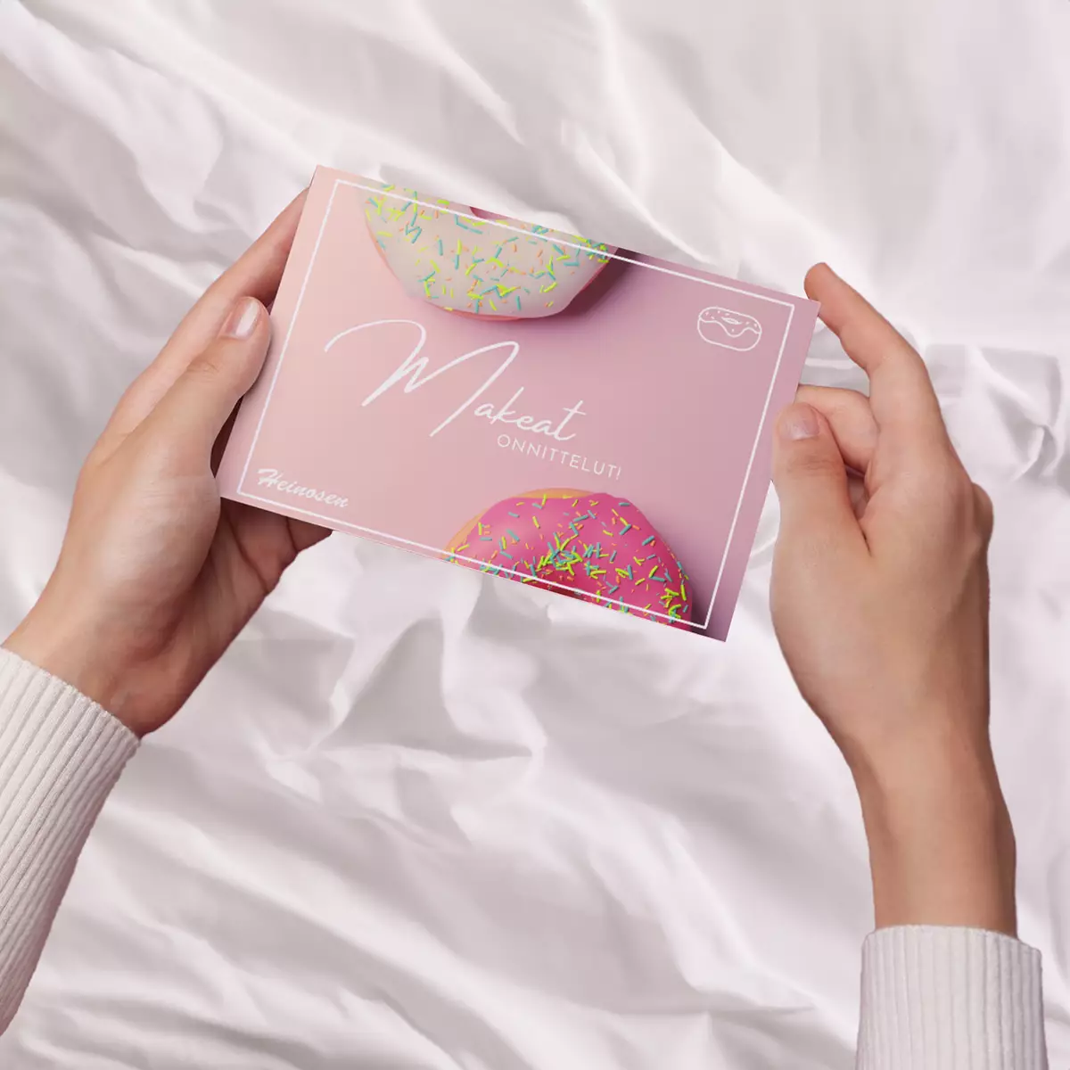 Kauniilla donitsiprintillä painettu vaaleanpunainen kortti on valmistettu Joensuussa laadukkaasta mattapintaisesta kartongista. Kortin etupuolella teksti "Makeat Onnittelut" ja kortin takapuolella tilaa personoidulle viestille. Postikortin koko n. 15cm x 10,5cm.