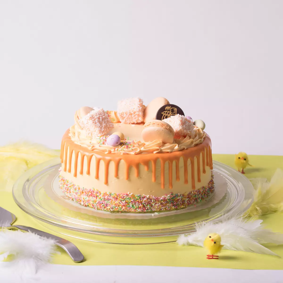 Miltä kuulostaisi kakkupala, jonka sisältä paljastuu persikka-passionmoussea ja rouskuvaa sitruunamarenkitäytettä? Entäpä jos kakkupalan kuorrute maistuisi appelsiinilta? Tämä pirteän värinen päsiäiskakku koristellaan näyttäväksi appelsiinin makuisella kreemillä ja appelsiinin sekä valkosuklaan makuisilla valumakorsteilla, leipomillamme passionhedelmän makuisilla macaronleivoksilla, käsin tehdyillä kookosvaahtokarkeilla ja pääsiäismakeisilla. Nami!