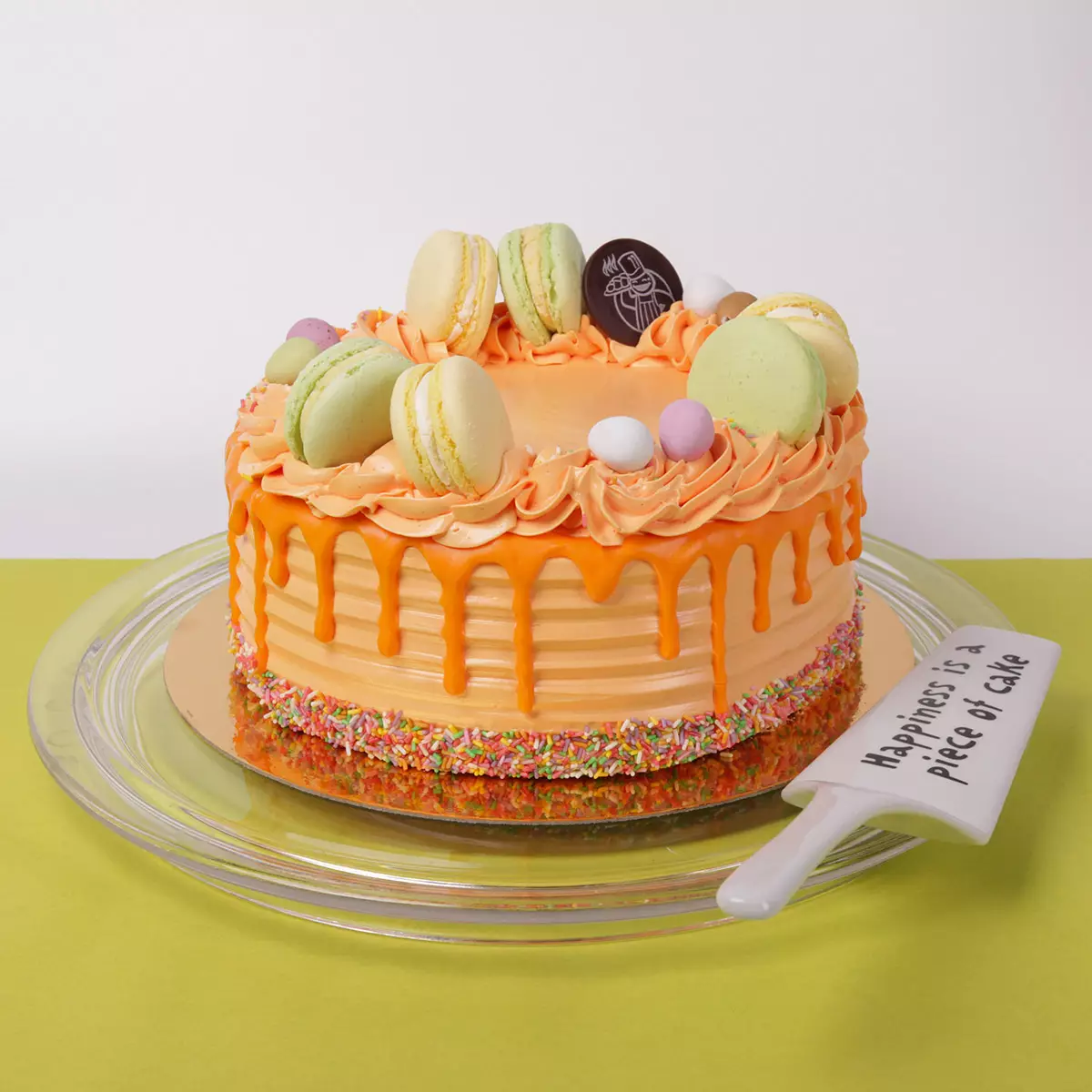 Miltä kuulostaisi kakkupala, jonka sisältä paljastuu persikka-passionmoussea ja rouskuvaa sitruunamarenkitäytettä? Entäpä jos kakkupalan kuorrute maistuisi appelsiinilta? Tämä pirteän värinen päsiäiskakku koristellaan näyttäväksi appelsiinin makuisella kreemillä ja appelsiinin sekä valkosuklaan makuisilla valumakorsteilla, leipomillamme sitruunan ja päärynän makuisilla macaronleivoksilla ja erilaisilla pääsiäismakeisilla. Nami!