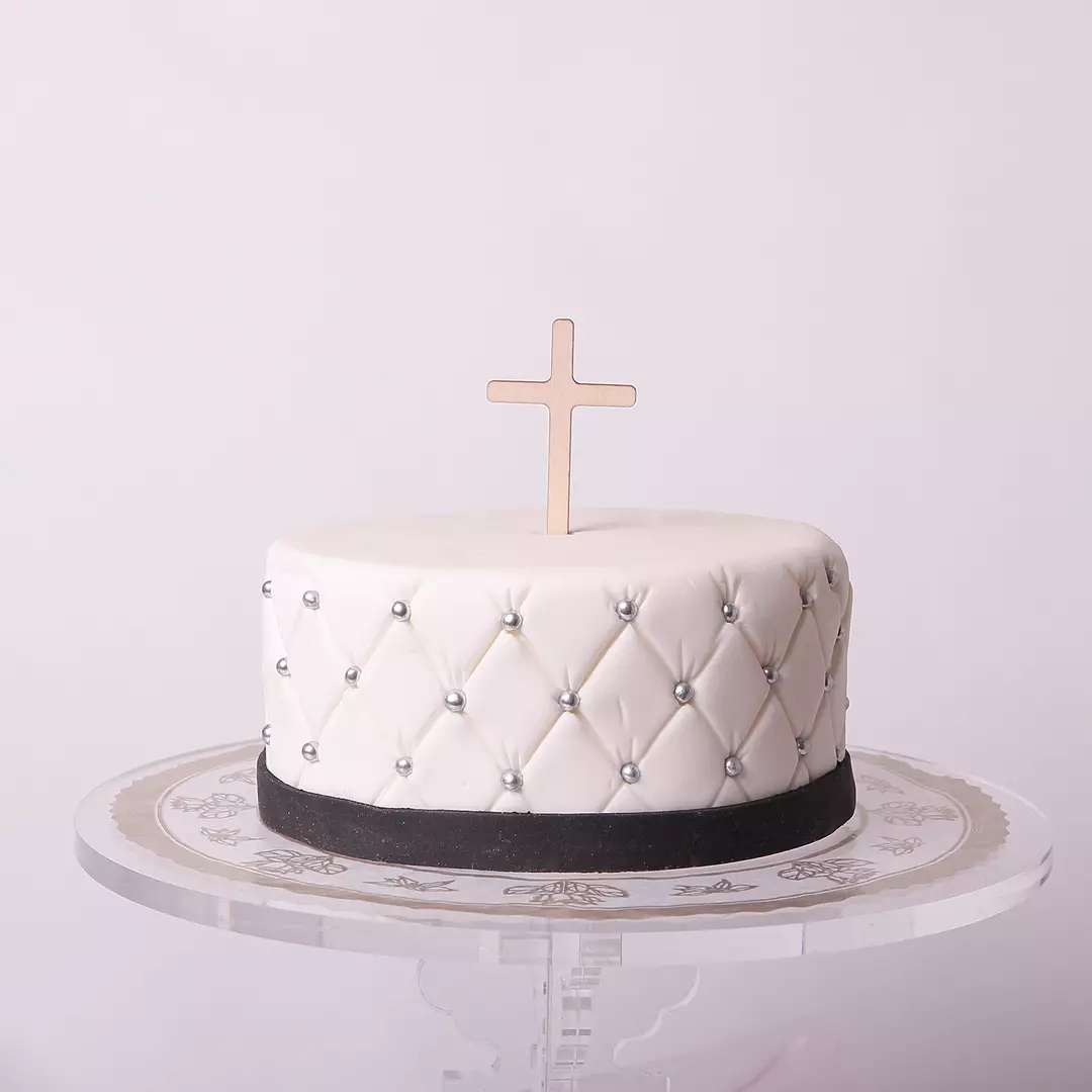 Tämä koriste on muita ristikoristeitamme korkeampi malli (13,5cm), ja koriste on tarkoitettu käytettäväksi kuvien tapaan pystyasennossa. Kakun viimeistely ei tätä helpommaksi enää voisi mennäkään, tökkäät vain ristin haluamaasi kohtaan kakun pinnalle ja voilá - valmista tuli!