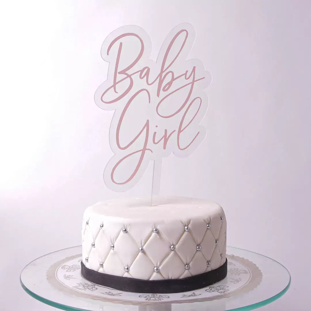 Suunnitteletko pienen tytön ristiäisten kattausta tai babyshowereita ystävällesi? Ihanaa! Tämä kaunis ja herkkä kakkukoriste on suunniteltu erityisesti pienokaisen nimiäisiin sekä baby shower-kutsuille. Hempeän vaaleanpunasävytteinen ja näyttävä kyltti sopii mihin tahansa valikoimiemme kakkuun. Erityisen upealta se näyttää vaaleanpunaisen 'Baby Girl' - kakun tai pinnalla.