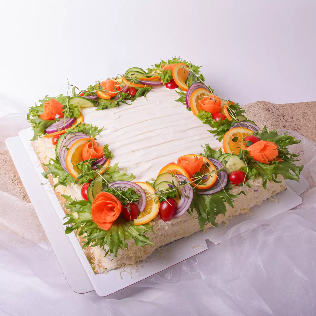 Suosittu fetavoileipäkakku - nyt myös suuremmassa koossa! Tämä vasta onkin oikea juhlapöydän ilopilleri! Oman leipomon moniviljaleivällä leivottu levykakku kätkee sisäänsä aidosta kreikkalaisesta fetajuustosta sekä kasviksista ja yrteistä valmistetun herkullisen täytteen. Kakku koristellaan näyttäväksi tuorejuusto-majoneesikuorrutteella, emmental-juustolla sekä värikkäillä tuoreilla kasviksilla. Kasvisvoileipäkakku ei ole koskaan maistunut näin hyvältä!