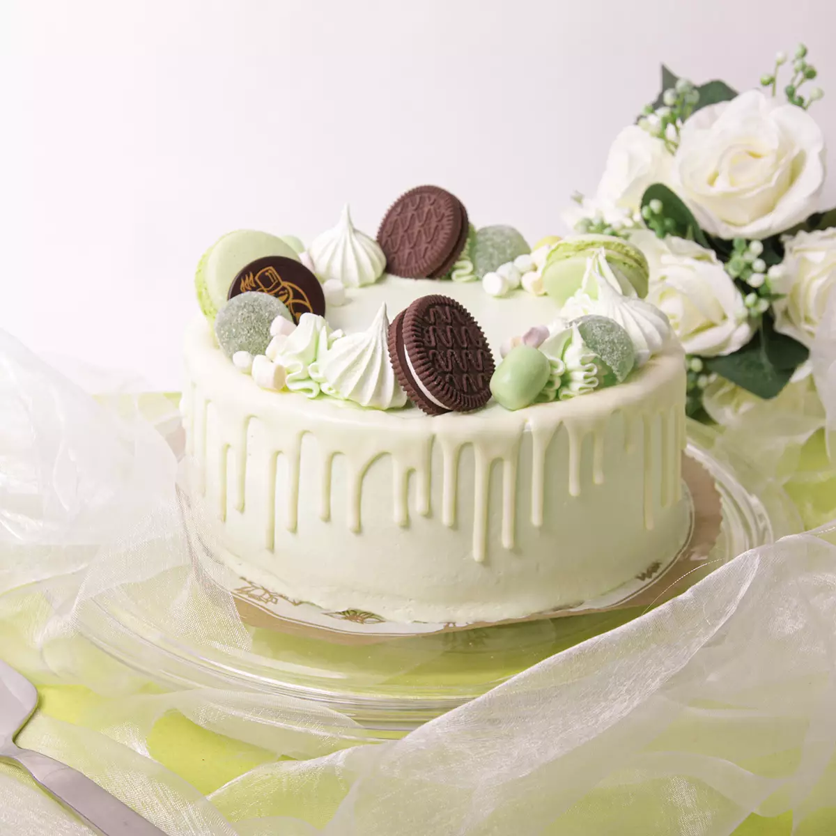 Hurmaava vaaleanvihreä Baby Baby -kakku on täydellinen valinta sukupuolineutraaleihin ristiäisiin, baby showereille ja lasten juhliin. Tämä gluteeniton herkku vie kielen mennessään, sillä se täytetään runsasmarjaisella mansikkamoussella. Kakun pintaa koristavat leipomon omat pistaasin makuiset macaronleivokset, kaakaopikkuleivät ja valkosuklaan makuiset valumat.