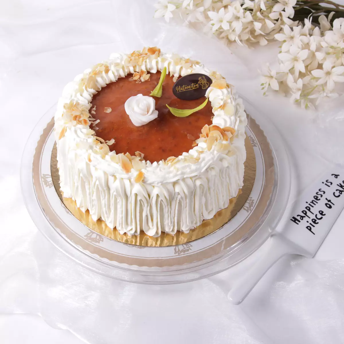 Tämän lakkakakun päältä löytyy runsaasti lakkahilloa ja kuohkeaa kermavaahtoa. Paahdetut mantelilastut antavat ihanan rapeutta ja koristeena oleva marsipaanista valmistettu valkea glitter-ruusu viimeistelee kakun silmiähivelevän kauniiksi kokonaisuudeksi.