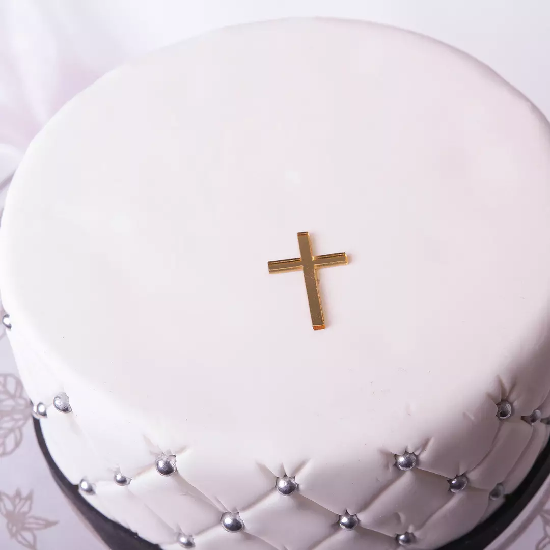 Kaunis ja edullinen pieni ristikoriste leivosten ja kakkujen koristeeksi. Valitse suosikkikakkusi laajasta valikoimastamme ja lisää kakku sekä pikkuinen ristikoriste ostoskoriin. Mini-risti toimitetaan pieneen muovirasiaan pakattuna. Tämä kultainen muovista valmistettu ristikoriste sopii esimerkiksi rippijuhlien tai muistotilaisuuksien kakkujen pinnan koristeeksi.