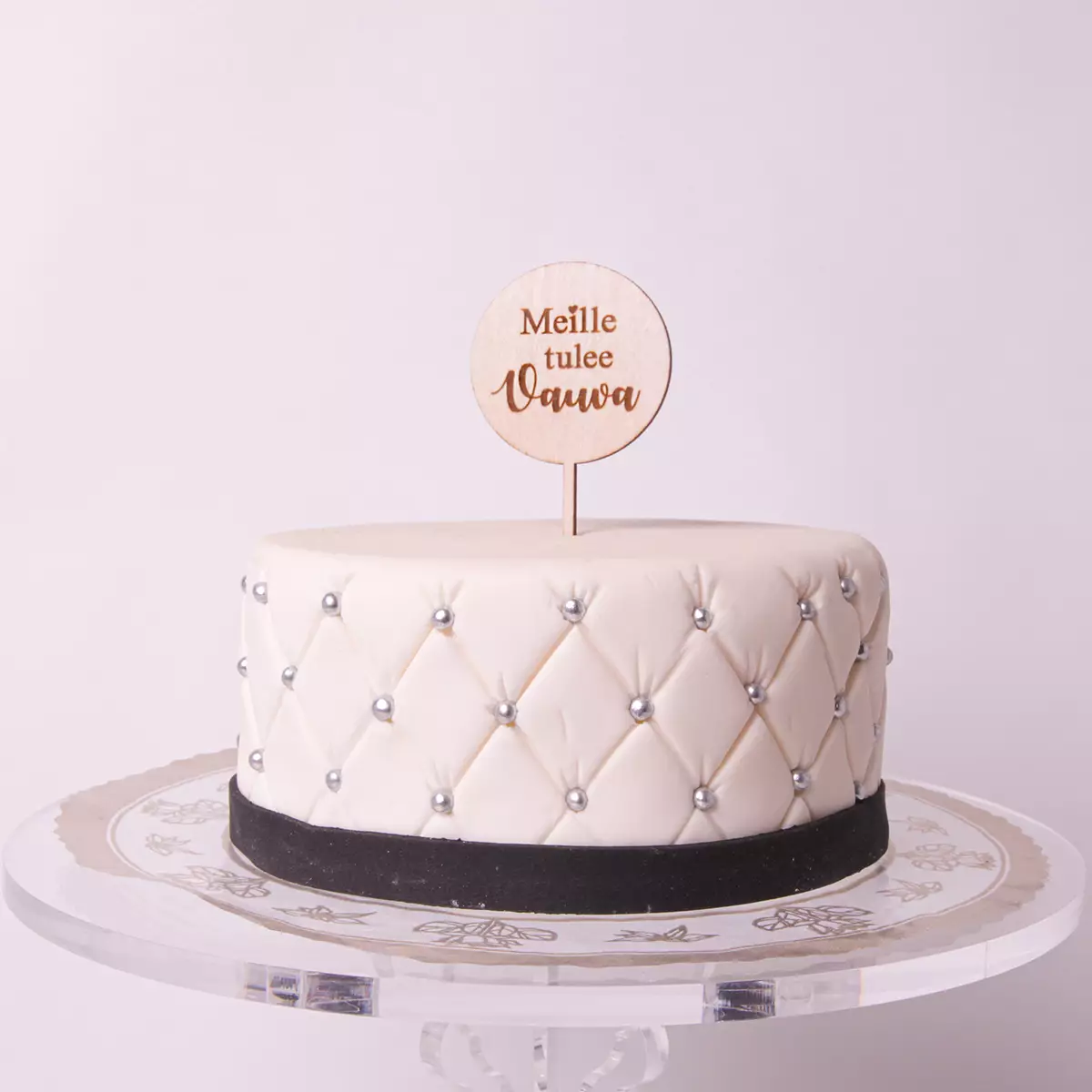 Tyylikäs design: Koristeen minimalistinen ja moderni design sopii täydellisesti niin pelkistetymmän, kuin näyttävämmänkin kakun koristeeksi.
