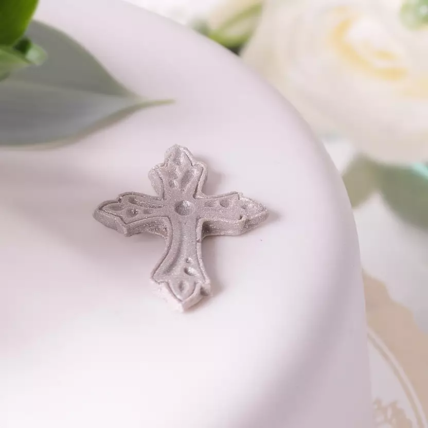 Käsin tehty ristikoriste, hopeiseksi värjättyä sokerimassaa. Valitse haluamasi kakku laajasta valikoimastamme ja lisää kakku sekä risti ostoskoriin. Koriste toimitetaan pieneen muovirasiaan... Lue lisää
