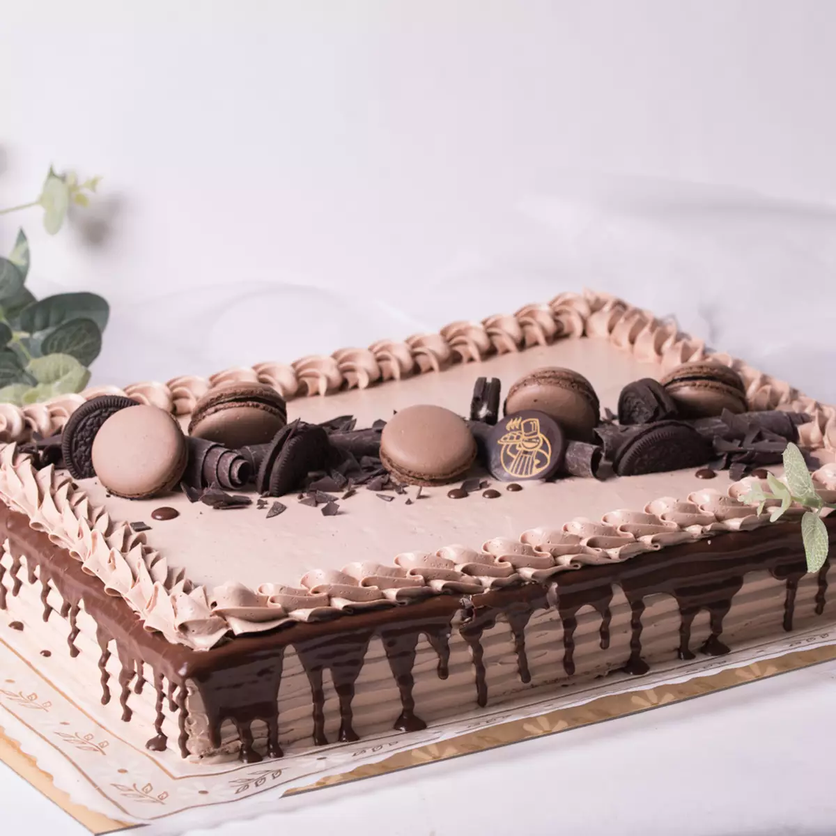 Jos pitäisi nimetä yksi lemppariherkku, olisiko vastauksena suklaa? Mikäli vastasit kysymykseen kyllä, olet löytänyt tiesi oikean kakun pariin. Isot juhlat ansaitsevat arvoisensa täytekakun ja kehitimme 30 henkilölle mitoitetun THE - etuliitteellä varustetun suklaalevyn, tai siis, levykakun kaikille suklaafaneille. Kilokakkulevy kätkee sisäänsä herkullista suklaamoussea ja kakku koristellaan näyttäväksi suklaan makuisella kreemillä ja valumilla sekä suklaalastuilla, Oreo-pikkuleivillä, suklaakarkeilla ja kondiittoriemme käsin leipomilla suklaisilla macaronleivoksilla. Voisiko kakulta edes toivoa enempää?
