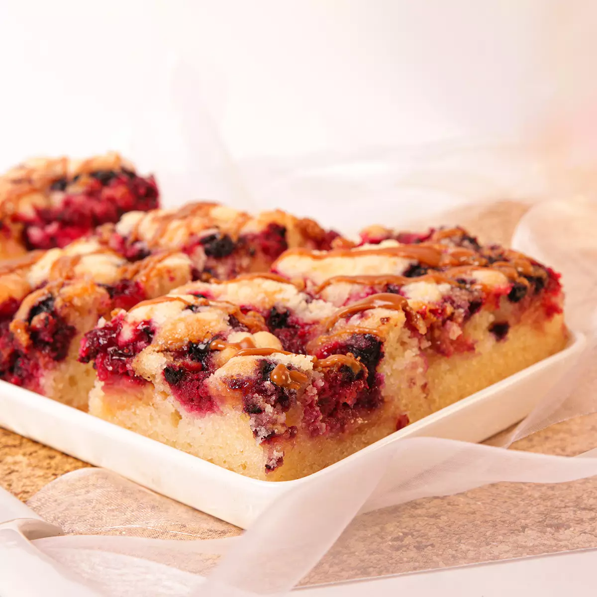 Kuningatar-Caramelpiirakka on mehevä leivonnainen, jossa yhdistyvät vadelmat, kotimaiset mustikat sekä samettinen carameltäyte ja kinuskiraidoitus. Pohjana on pehmeän vaniljainen gluteeniton leivospohja, joka kruunaa kokonaisuuden lempeällä maullaan.