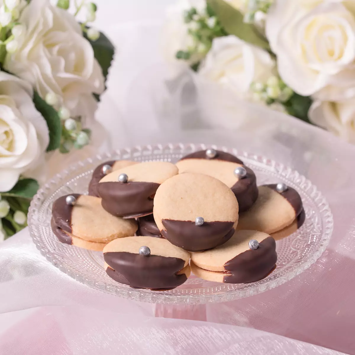 Pikkuleipä viimeistellään hopeisen värisellä sokerihelmellä